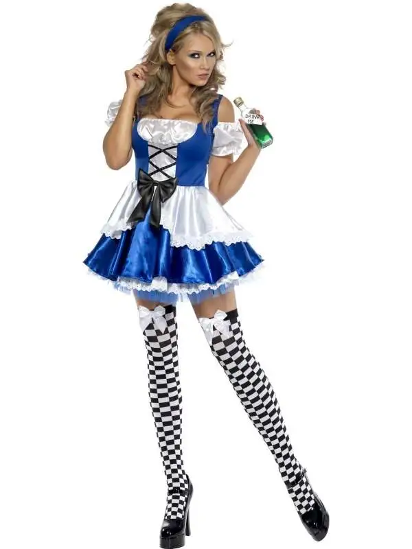 Alice in Wonderland Kostuum. Inbegrepen is de sexy blauw-witte jurk met rijgsluiting aan de voorkant en de haarband. De kousen en petticoat verkopen we los.Ā