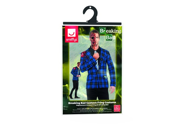 Bekend van de tv serie Breaking Bad, Breaking Bad Gustavo Fring Kostuum, DIt kostuum bestaat uit een blauw jasje, mock shirt met stropdas en protetishe wond met bloed en lijm.