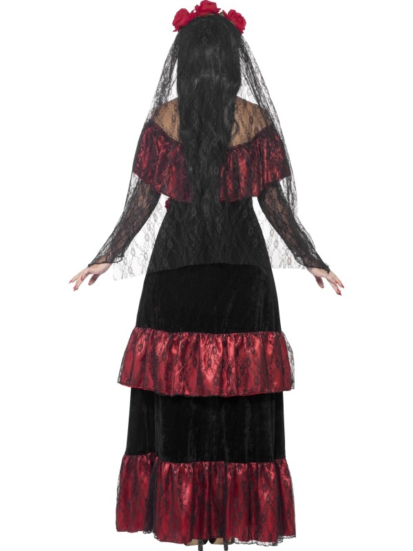 Ga deze Halloween verkleed in dit Day of the Dead Bride Halloween Kostuum, bestaande uit de lange rood – zwarte jurk met rode roos en zwarte sluier met rode rozen. Maak de look compleet met onze Day of the Dead Schmink.