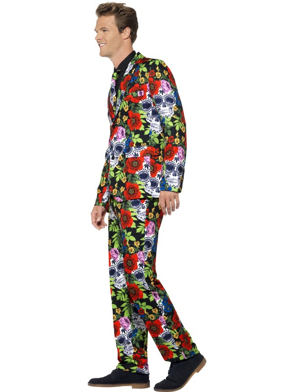Day of the Dead Net Herenpak Halloween. Inbegrepen is de all-over print broek, het colbert jasje en de stropdas. Geen saaie pakken meer naar je feestjes of je werk? Met onze nieuwe hippe geprinte herenpakken valt u gegarandeerd op. De pakken vallen redelijk groot uit, bij twijfel adviseren wij de kleinere maat te kiezen Wij verkopen ook het bijpassende dames kostuum.