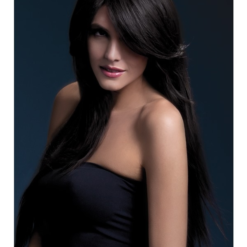 Donker bruine pruik, lang en stijl met een gelaagde pony.