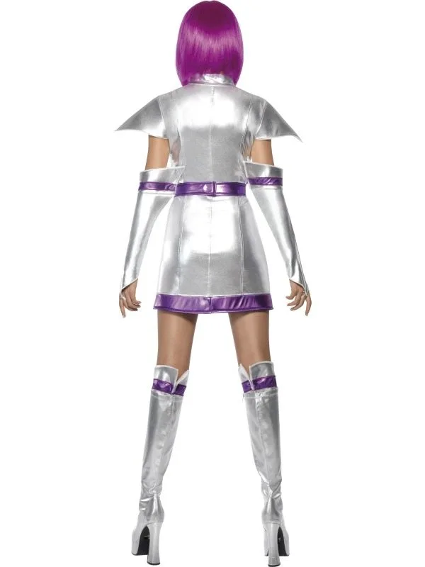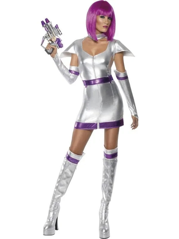 Fever Space Cadet Dames Kostuum. Inbegrepen is de sexy zilveren mini jurk, riem, aparte mouwen/ handschoenen en zilverkleurige laarskappen. De pruik verkopen we los.Ā