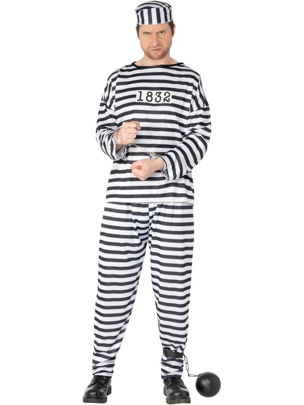 Gevangenen Boeven Heren Verkleedkleding. Inbegrepen is het gestreepte shirt met nummer, de gestreepte broek en pet. Compleet verkleedkleding.