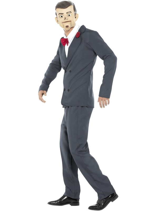 Goosebumps Slappy the Dummy kostuum bestaande uit een grijs jasje en broek, mockshirt met strik en het masker.