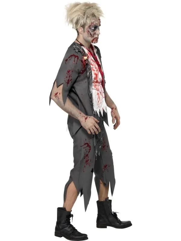 High School Horror Zombie School Boy Kostuum, bestaande uit het gescheurde jasje met shirt en stropdas en broek. We verkopen de halloween horror schmink setjes, contaclenzen en accessoires los.Ā