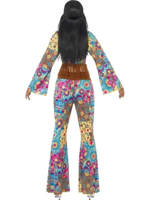 Hippy Flower Power Dames Kostuum. Inbegrepen is de vrolijk gekleurde top, broek, riem en haarband. Compleet dames kostuum.