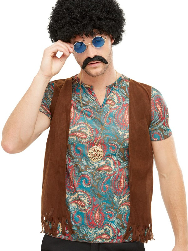 Hippie Instant Kit, bestaande uit de zwarte pruik, zonnebril, snor en ketting. bekijk hier onze gehele Hippie Collectie.