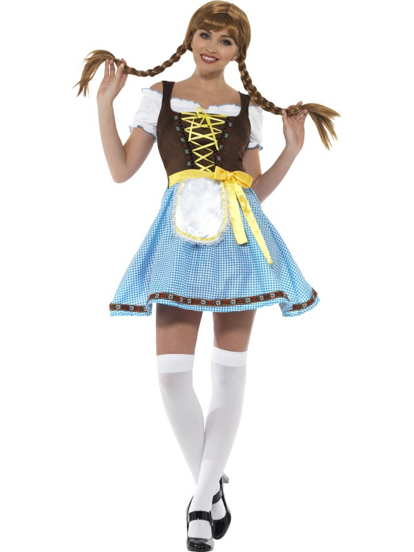 Een geweldige blauw/witte Olga Bavarian Costume, bestaande uit een jurk met short, top & Mock Suede Bodice. Leuk voor een Tirolerfeestje of het Oktoberfest.