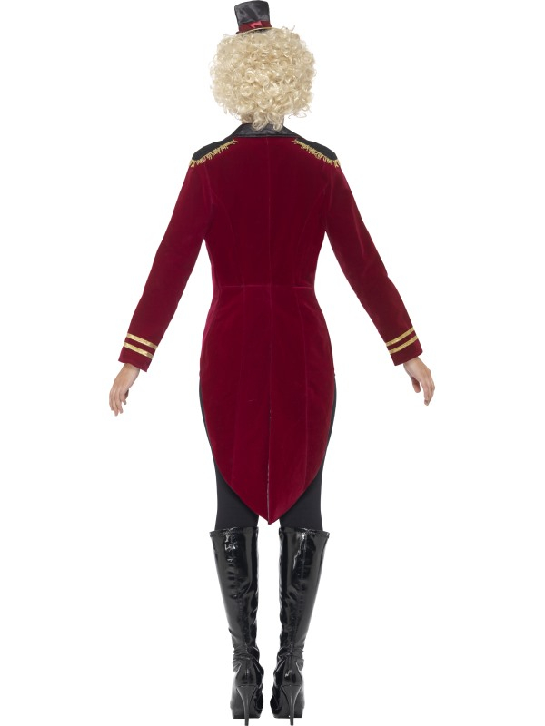 Ringmaster Kostuum, bestaande uit een rood jasje, kraag en bijpassend hoedje.