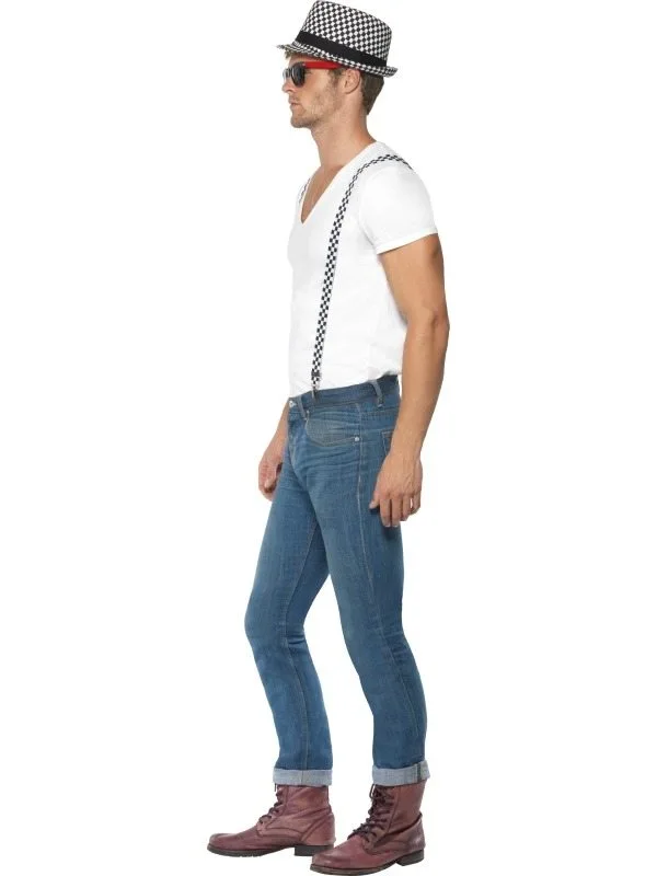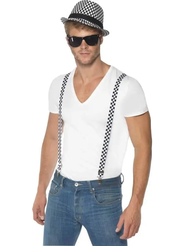 Ska Two Tone 2-delig Verkleedsetje. Inbegrepen is de zwart/wit geblokte hoed en de bretels.Ā