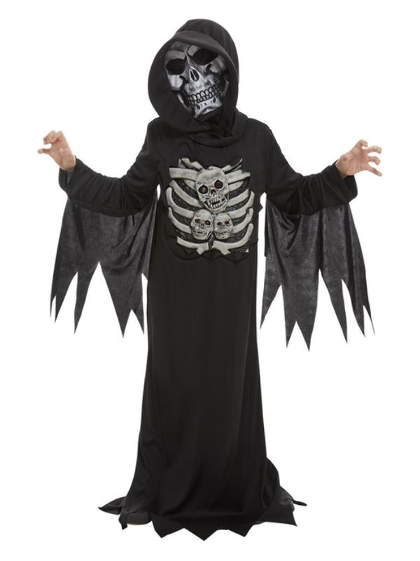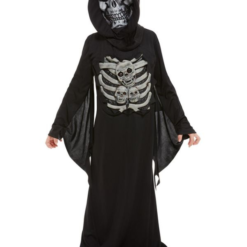 Skeleton Reaper Kinderkostuum. Dit kostuum bestaat uit het zwarte gewaad met touw, latex borstkas en masker. Met dit kostuum ben je in 1 keer klaar voor jouw Halloweenparty.