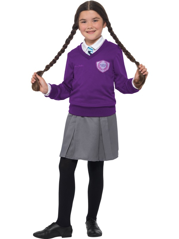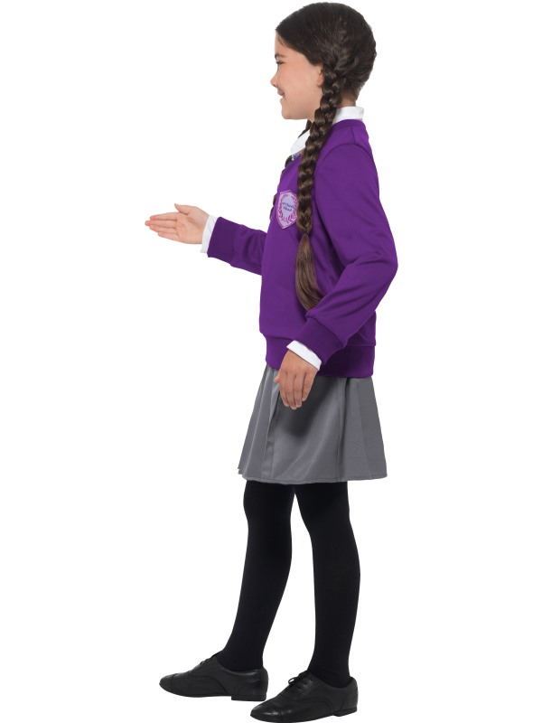 St Clare’s Kostuum, bestaande uit een paarse trui met mock shirt, rokje, stropdas en mailliot.