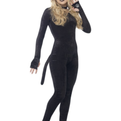 Velour Cat Kostuum – het kostuum bestaat uit een velours zwarte jumpsuit met aangehechte staart, een zwarte diadeem met kattenoortjes en een zwarte halsband. Wij verkopen ook schmink setjes en andere accessoires om de outfit compleet te maken!
