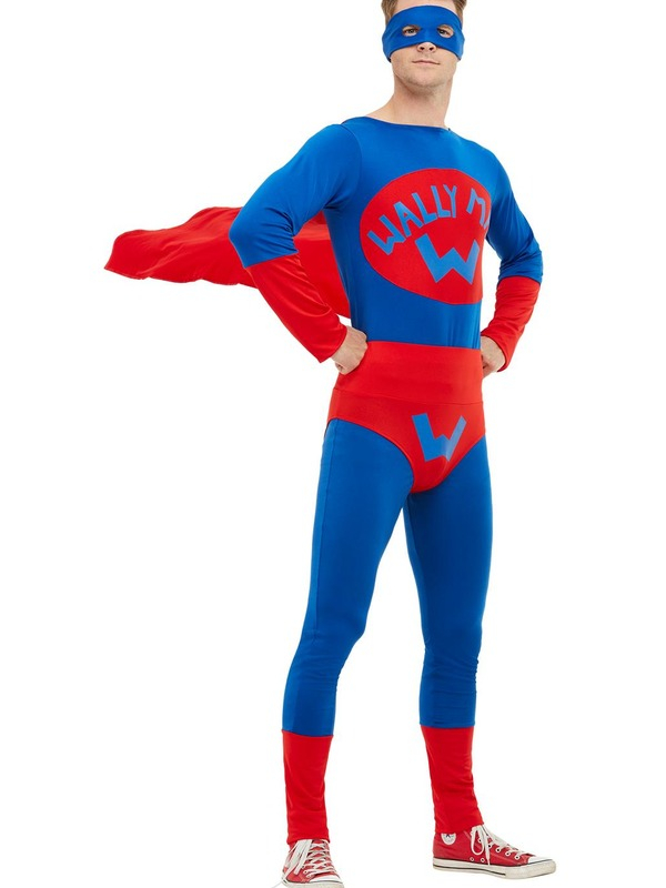 Wallyman Heren Verkleedkleding. Superheld Wallyman met blauw/rode jumpsuit, onderbroek, sokken en oogmasker. Compleet kostuum.