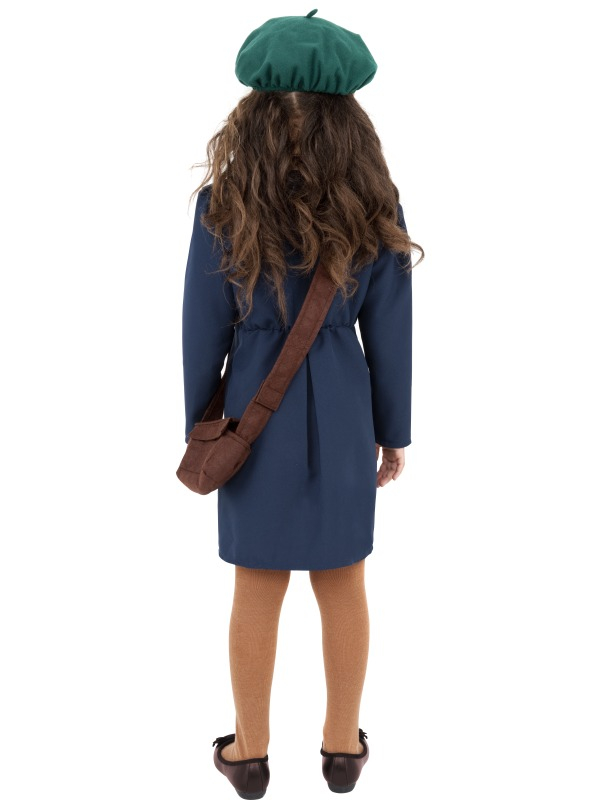 Ā World War II Evacuee Girl Kostuum, bestaande uit de blauwe jurk met hoed en tasje.