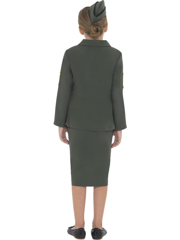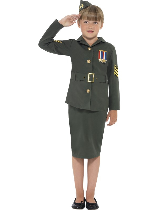 Heb je een musical, optreden of gewoon een feestje met thema kies dan voor dit mooie Khaki Groene WW2 Army Girl Kostuum, bestaande uit een jasje met rok, riem en hoed.