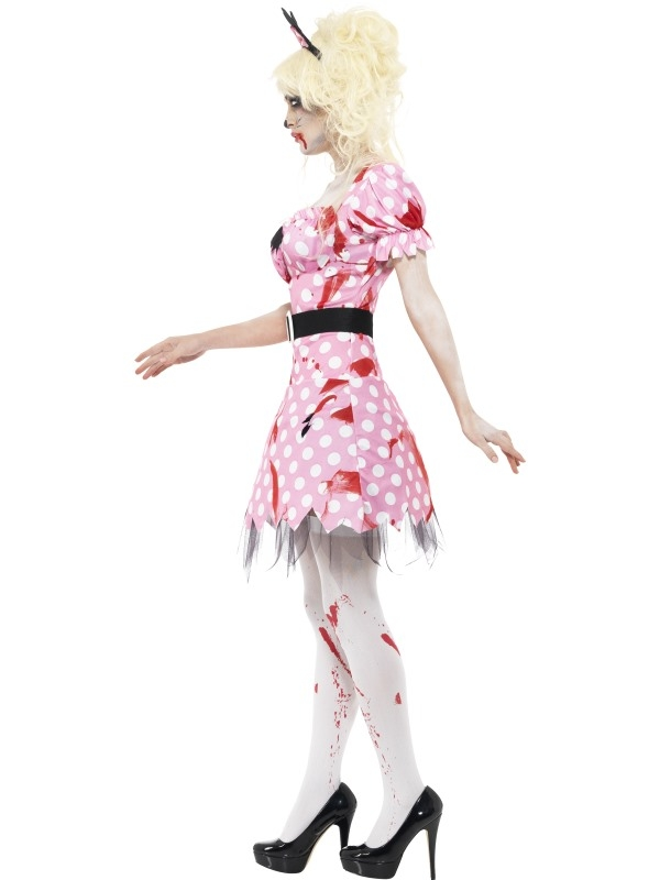 Zombie Minnie Mouse Horror Kostuum. Inbegrepen is de gescheurde minnie mouse jurk met bloedvlekken met riem en de haarband met minnie mouse oren. De horror accessoires verkopen we los.Ā