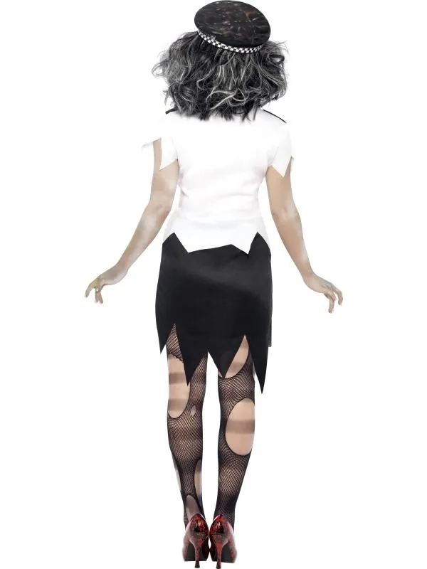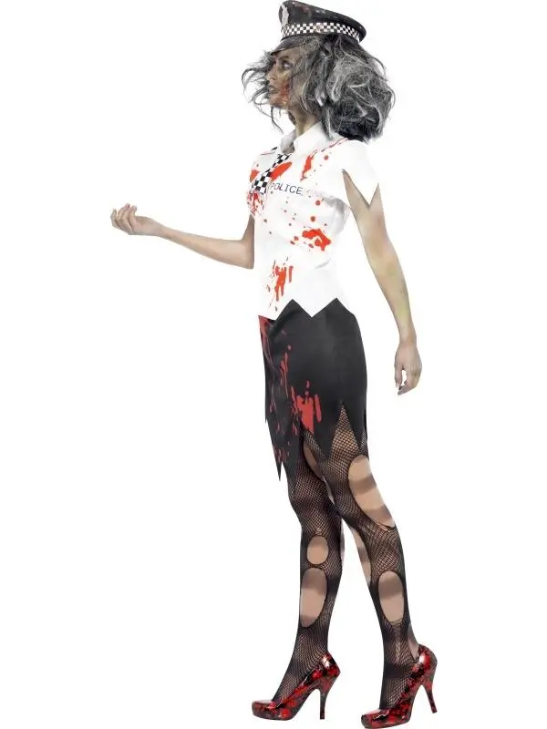 Zombie Politieagente Halloween Kostuum. Inbegrepen is het witte shirt met stropdas en bloedspatten, zwarte rok met bloedspatten en de politiepet