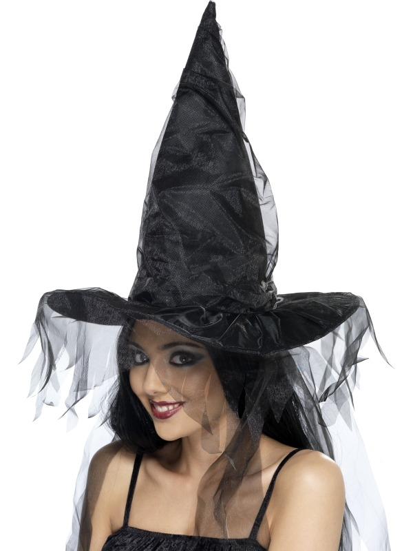 Zwarte Heksenhoed met Sluier (rondom). We verkopen nog veel meer heksenhoeden en heksen verkleedkostuums voor halloween of andere feesten.Ā
